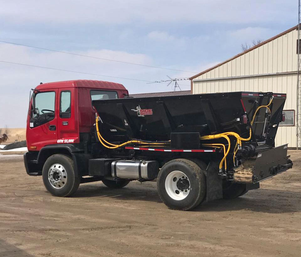 Truck Mount Side-Shooter are used to spread sand or sawdust in many applications including free stall barns. The Truck Mount Side-Shooter uses a main conveyor to transfer the material to a cross conveyor that dispenses the material 3ft to 25ft.